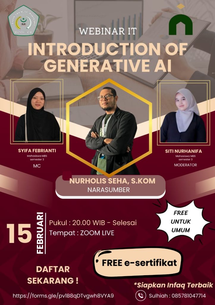 Bogor, 15 Februari 2025 – Perkembangan kecerdasan buatan (Artificial Intelligence atau AI) semakin pesat, membawa perubahan signifikan dalam berbagai aspek kehidupan. Untuk memperdalam pemahaman tentang teknologi ini, Divisi Pendidikan BEM Institut Nida El-Adabi yang diketuai oleh Rosita Nur Hanifah sukses menggelar webinar bertajuk “Introduction of Generative AI” pada 15 Februari 2025. Acara ini berlangsung sukses dengan partisipasi aktif dari berbagai kalangan, mulai dari akademisi, mahasiswa, pelajar, hingga masyarakat umum yang tertarik dengan AI generatif.