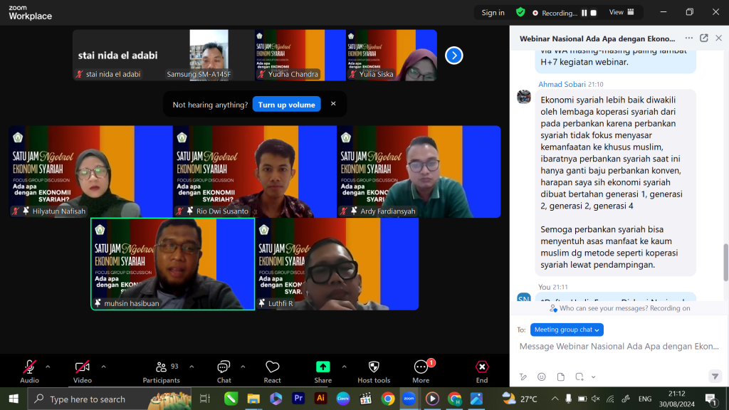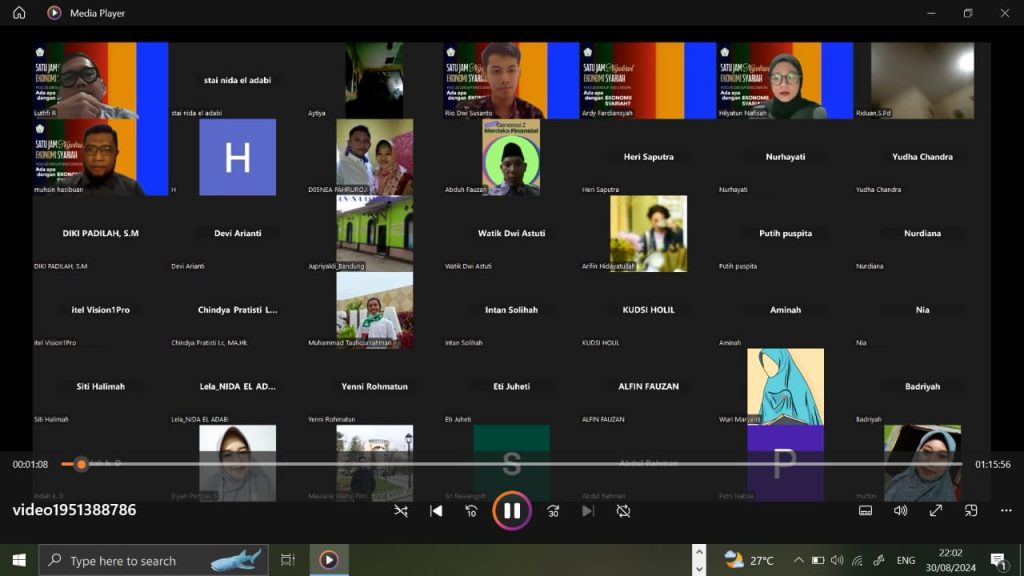 Kabupaten Bogor – Program Studi Ekonomi Syariah STAI Nida El Adabi sukses menggelar Focus Group Discussion (FGD) lingkup Nasional bertajuk “Ada Apa dengan Ekonomi Syariah?” pada Jumat, 30 Agustus 2024. Diskusi yang diadakan secara daring melalui Zoom Meeting ini menarik minat lebih dari 93 peserta, mulai dari mahasiswa, dosen, hingga masyarakat umum yang ingin mendalami konsep dan penerapan ekonomi syariah.