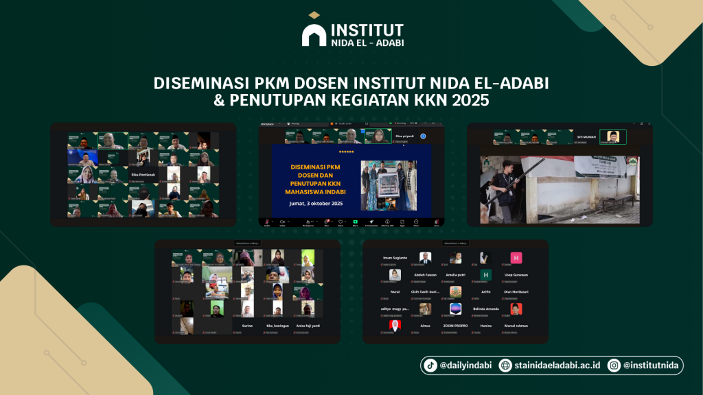 Institut Nida El-Adabi menyelenggarakan kegiatan Diseminasi PKM Dosen dan Penutupan Kegiatan KKN 2025 pada Jumat, 3 Oktober 2025. Acara ini dilaksanakan secara daring melalui Zoom mulai pukul 09.00 WIB dan diikuti oleh sivitas akademika serta mahasiswa Institut Nida El-Adabi.