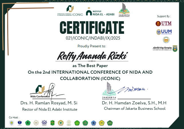 Prestasi membanggakan kembali diraih oleh sivitas akademika Institut Nida El Adabi dalam ajang 2nd International Conference of Nida and Collaboration (ICONIC) 2025. Dua perwakilan terbaik kampus berhasil menorehkan prestasi yang membanggakan di tingkat internasional: Akmaluddin Rois, mahasiswa semester 3 Program Studi Manajemen Bisnis Syariah (MBS), meraih predikat Best Presenter, dan Reffy Ananda Rizki, dosen Institut Nida El Adabi, dinobatkan sebagai peraih Best Paper Award.