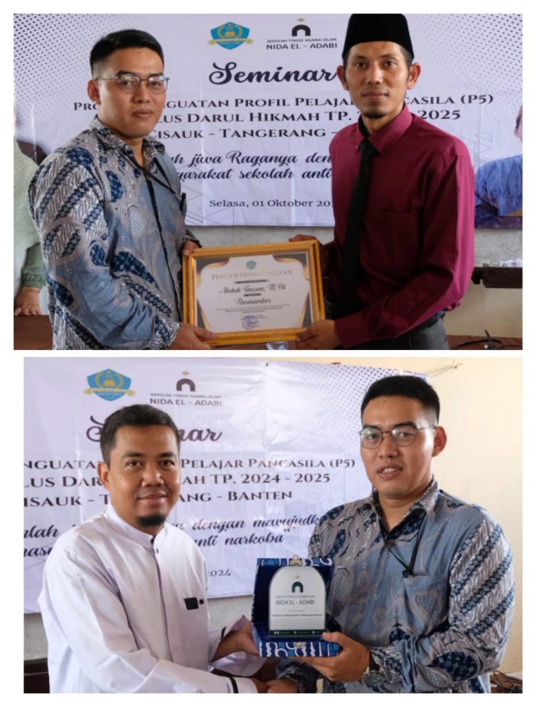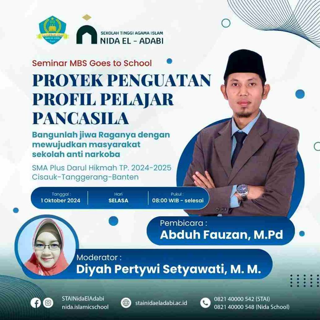 Tangerang, 1 Oktober 2024 – Dalam upaya memperkuat karakter dan nilai-nilai kebangsaan di kalangan pelajar, Program Studi Manajemen Bisnis Syariah (MBS) Sekolah Tinggi Agama Islam (STAI) Nida El-Adabi yang diketuai oleh Bapak Fahrul Hidayat, M.M. sukses mendukung penyelenggaraan seminar bertajuk “Proyek Penguatan Profil Pelajar Pancasila” yang diselenggarakan oleh SMA Plus Daarul Hikmah Cisauk, Tangerang-Banten. Dengan tema “Bangunlah Jiwa Raganya dengan Mewujudkan Masyarakat Sekolah Anti Narkoba,”
