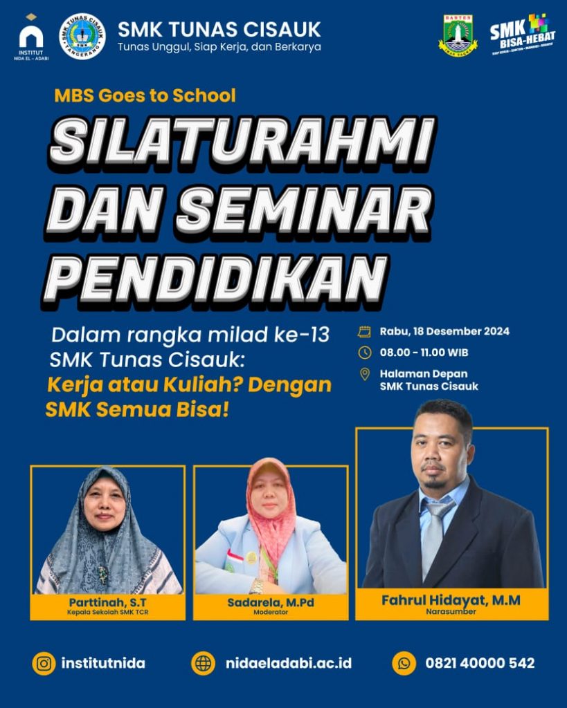 Cisauk, 18 Desember 2024 – Dalam rangka memperingati Milad ke-13 Yayasan Tunas Cisauk, SMK Tunas Cisauk menggelar seminar pendidikan bertema “Kerja atau Kuliah? Dengan SMK Bisa!”. Acara ini berlangsung meriah dengan menghadirkan narasumber inspiratif, Fahrul Hidayat, M.M., seorang dosen dari Institut Nida El Adabi yang juga merupakan lulusan SMK. Ia membawa pengalaman panjang di dunia industri hingga akhirnya meniti karir di dunia pendidikan., serta dimoderatori oleh Sadarela, M.Pd., seorang dosen berpengalaman di bidang pendidikan Institut Nida El Adabi.