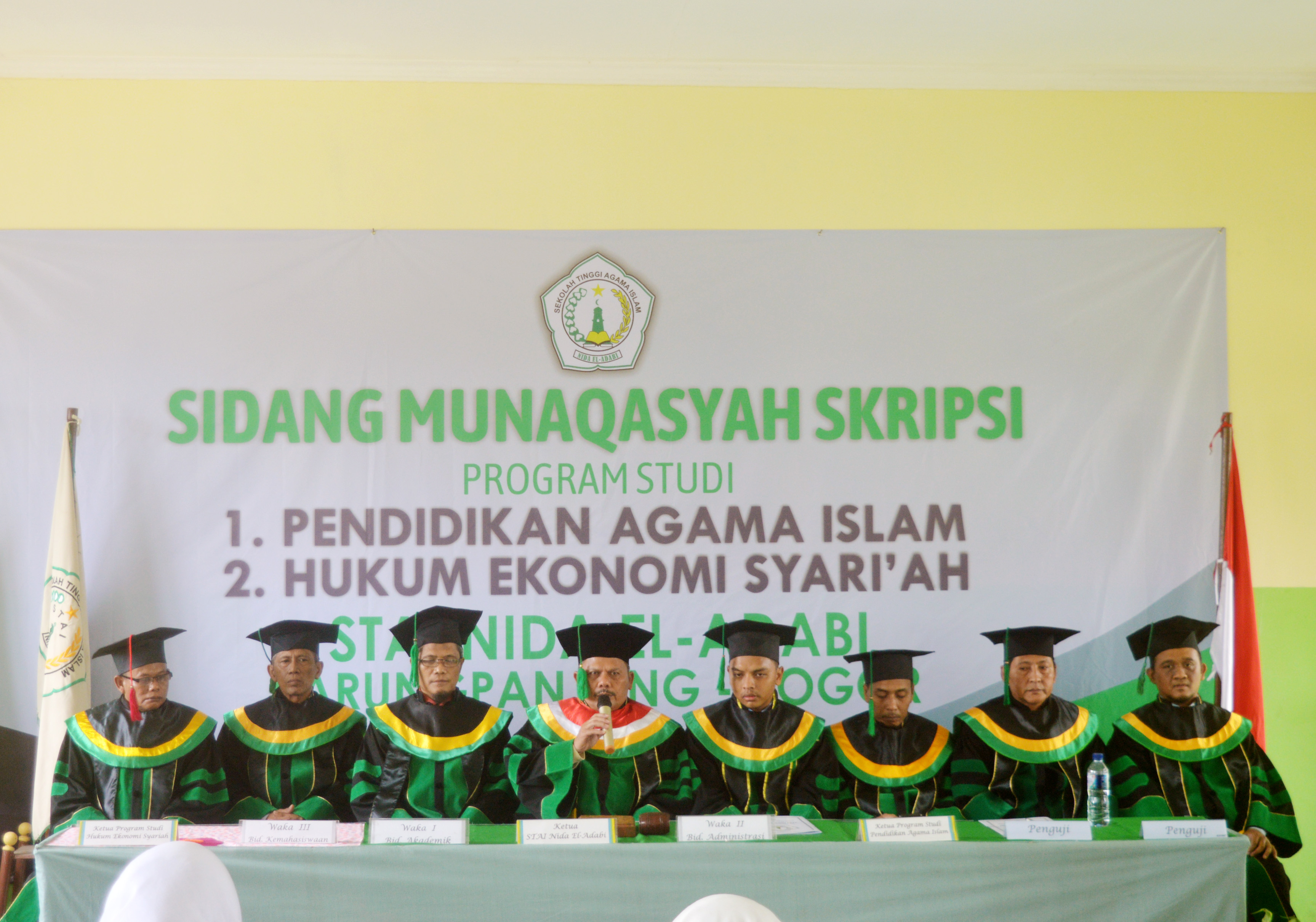Sidang yang berlangsung pada Sabtu, 20 Juli 2019 ini dibuka langsung oleh Ketua STAI Nida El Adabi, Drs. H. Ramlan Rosyad, M.Si. Mahasiswa yang dapat mengikuti sidang kali ini adalah mahasiswa yang sudah memenuhi persyaratan akademis yang telah ditetapkan oleh pihak kampus. Sidang periode I kali ini diikuti oleh 42 mahasiswa jurusan Pendidikan Agama Islam dan Hukum Ekonomi Syariah yang telah selesai skripsinya dan disetujui oleh pembimbing. Bagi mahasiswa yang skripsinya belum memperoleh rekomendasi dari dosen pembimbing skripsi belum diperkenankan mengikuti sidang kali ini dan mengikuti sidang periode selanjutnya.