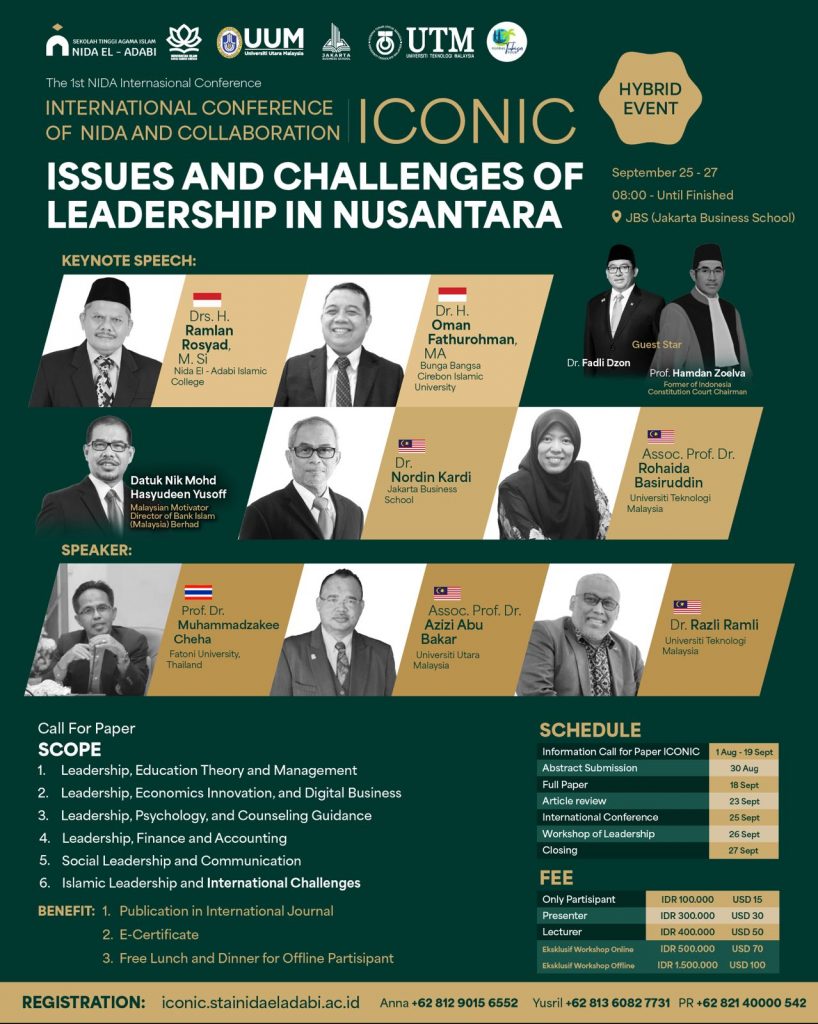 Jakarta – STAI Nida El-Adabi bekerja sama dengan sejumlah mitra perguruan tinggi dan instansi lain dari dalam dan luar negeri, di antaranya Jakarta Business School (JBS), Universiti Utara Malaysia, Universiti Teknologi Malaysia, Fatoni University Thailand, Universitas Islam Bunga Bangsa, Tubisa Global Wisata, dan Ikatan Keluarga Minang (IKM) menyelenggarakan “The First International Conference of Nida Collaboration (ICONIC) 2024” bertempat di K-Link Tower JBS, Jakarta, pada 25-26 September 2024.